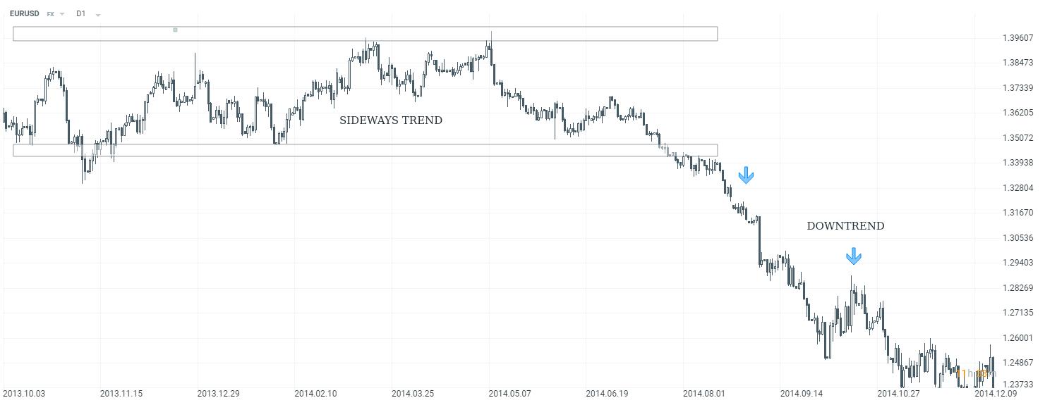 Como se puede ver en el siguiente ejemplo, el EURUSD estuvo negociando de lado antes de que se estableció una tendencia a la baja y los vendedores dominaron a los compradores, llevando los precios hacia abajo.