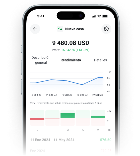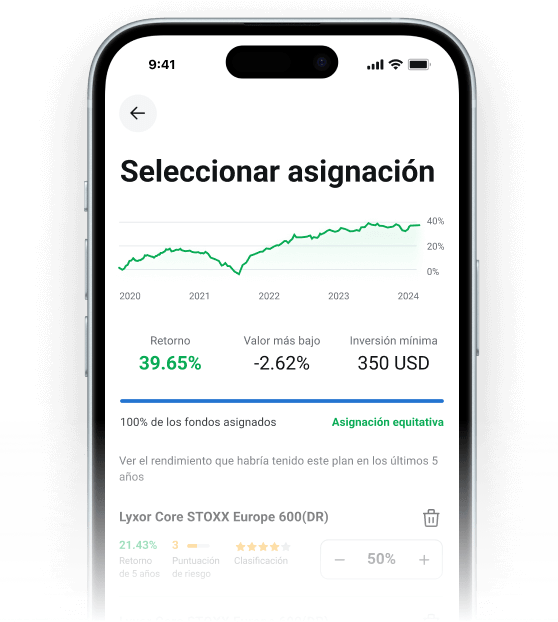 Crea tu Plan de forma sencilla gracias a la interfaz intuitiva que te guiará paso a paso. Empieza a invertir desde tan solo 15 EUR o equivalente en la divisa de la cuenta.
