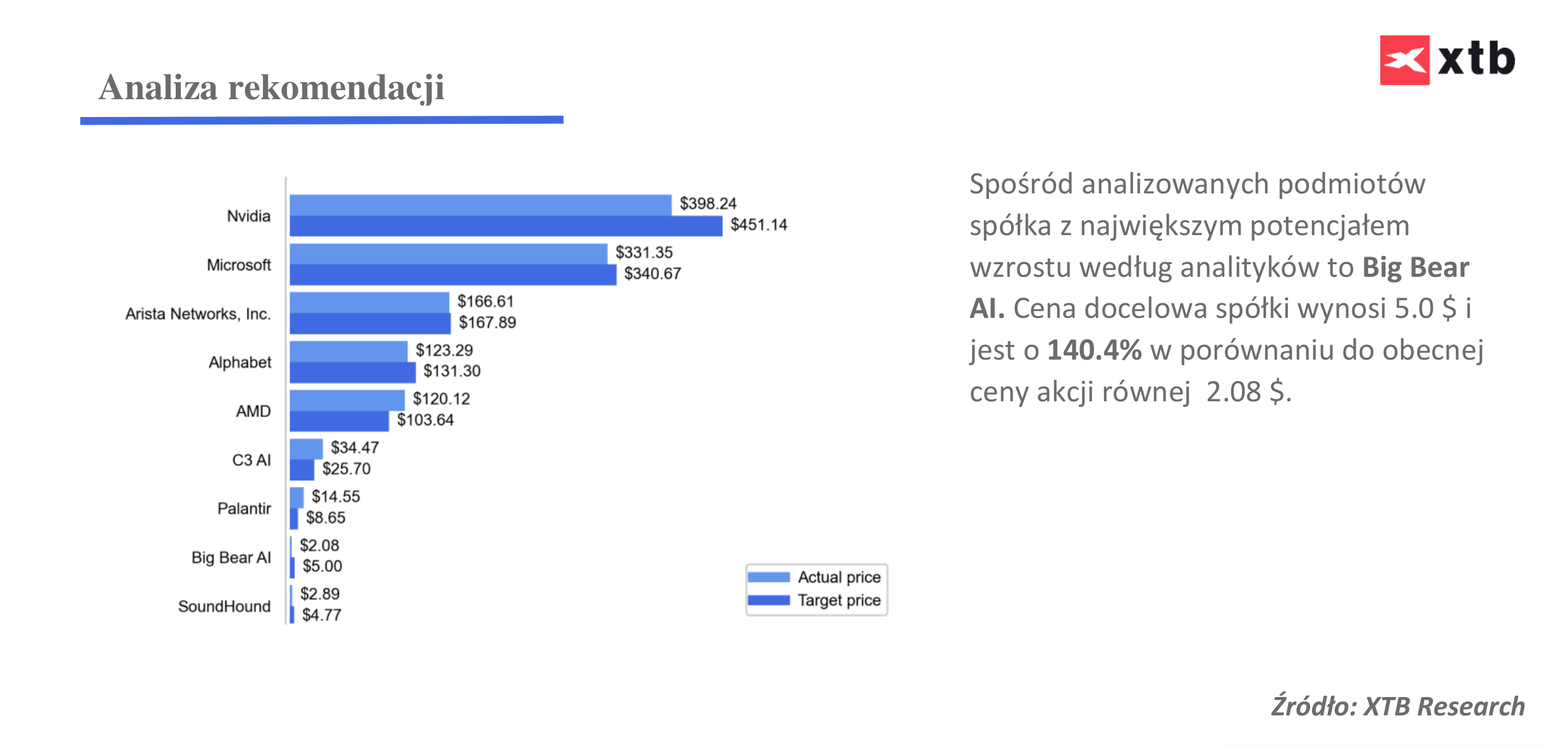 Euforia związana z AI sprawia, że analitycy podnieśli w ostatnim czasie rekomendacje dla wielu spółek korzystających z tego trendu. Mimo potężnej premii w relacji do wyceny fundamentalnej, Wall Street widzi wciąż spory potencjał dla Nvidia. Rekordową premię od bieżącej wyceny spółki wskazał fundusz Oppenheimer - podniósł cenę docelową dla Big Bear AI (BBAI.US) z 10 USD do 15 USD za akcję. Akcje spółki kosztują obecnie 2 USD. Warto wskazać jednak, że żadna rekomendacja nie jest jednoznaczna z faktycznym osiągnięciem prognozowanego pułapu cenowego.