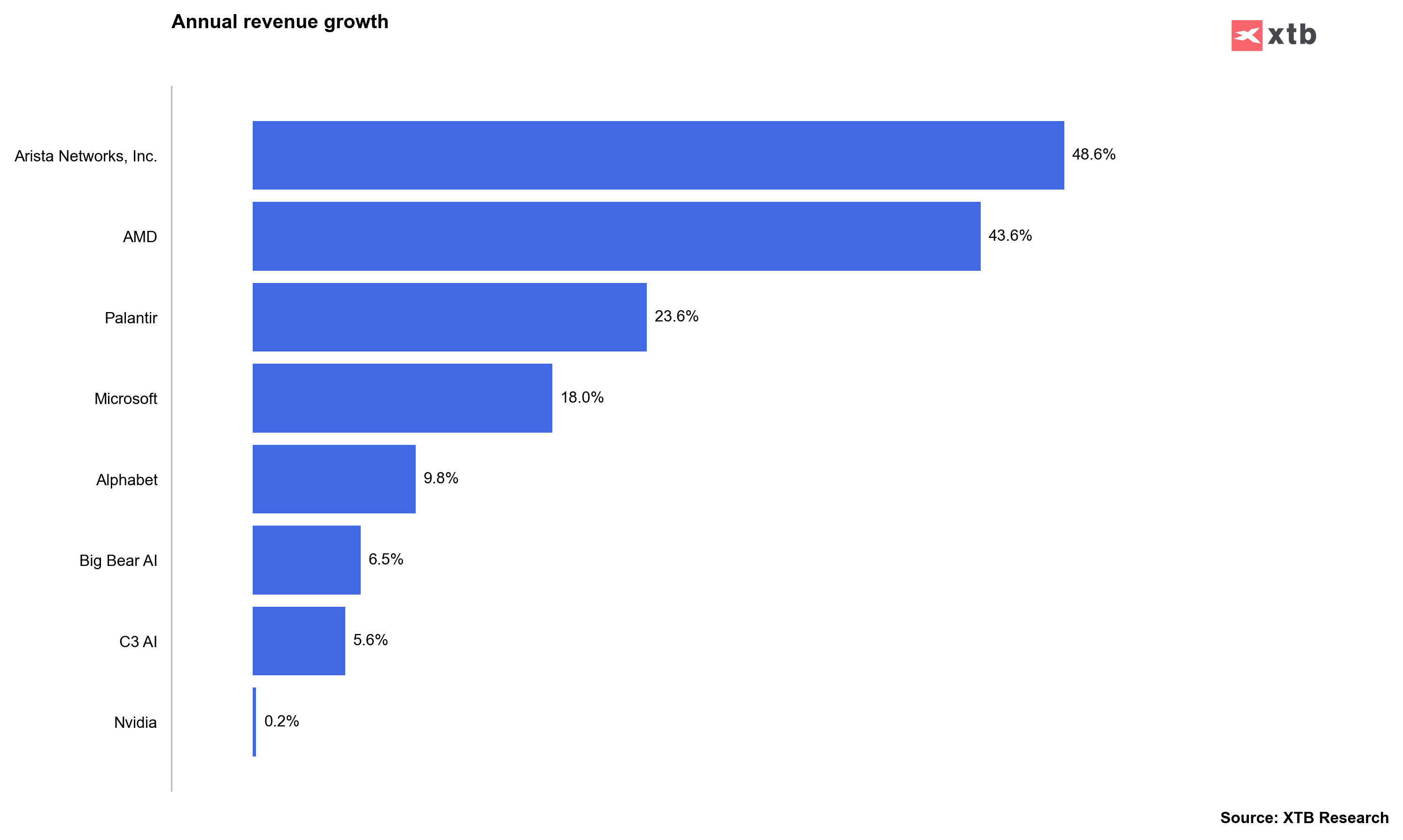 Spośród spółek AI, w ujęciu rocznym najniższy wzrost przychodów (0,2% r/r) odnotowała Nvidia (NVDA.US). Rynek nie przejął się tym jednak - widzi w niej beneficjenta ‘kolejnego rozdziału’ hossy.