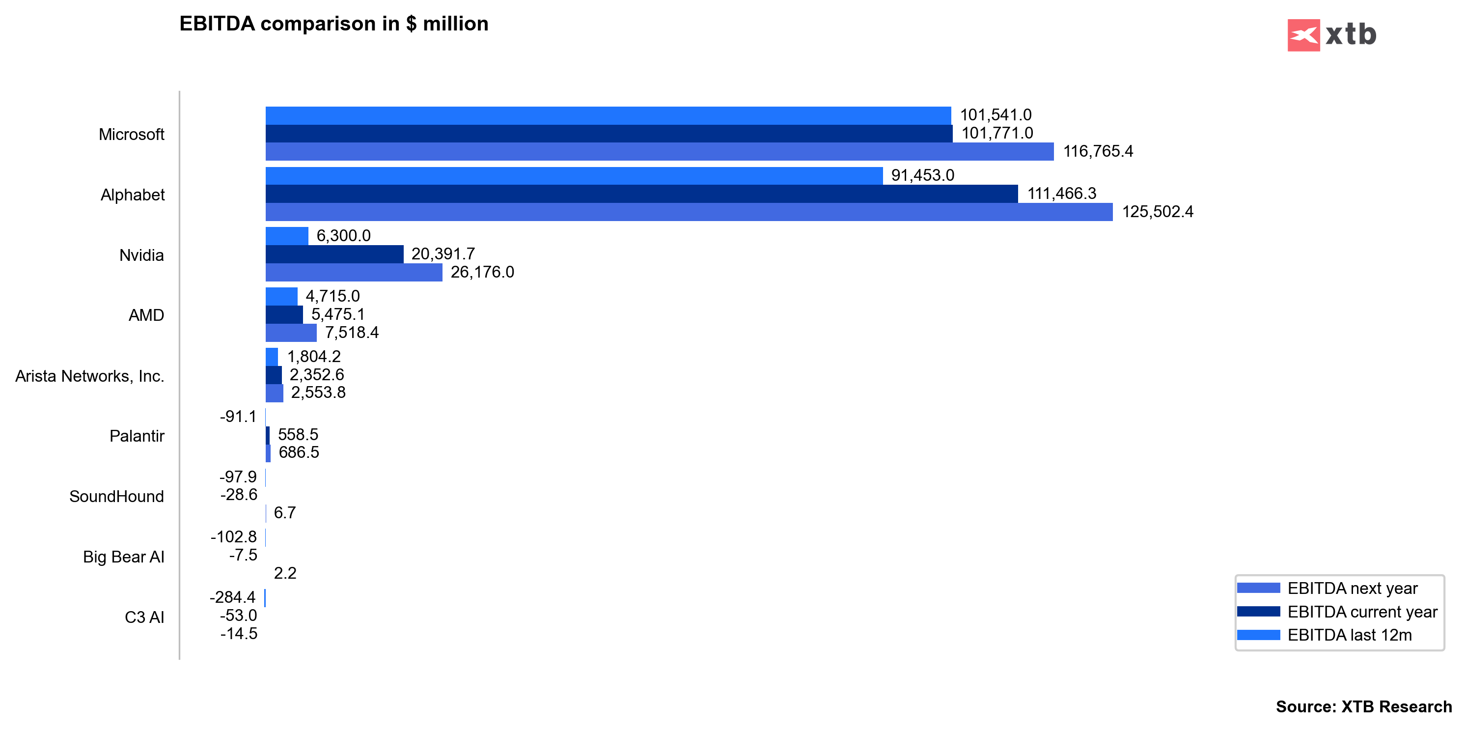 Patrząc na skumulowane stopy zwroty od 2020 roku, na prowadzenie wśród wybranych spółek AI wyłania się Nvidia (NVDA.US) oraz Arista Networks (ANET.US). Porównanie pokazuje też, że w kilkuletnim horyzoncie czasowym spółki AI o niskiej kapitalizacji wyglądają jak maruderzy. Jednak od początku 2023 roku C3.ai, BigBear AI oraz Sounhound AI zyskały odpowiednio 260%, 202% oraz 132%. W wymagającym otoczeniu makro mniejsze i zadłużone spółki mogą mieć problemy związane z trudnym dostępem do finansowania i ‘spalaniem gotówki’.