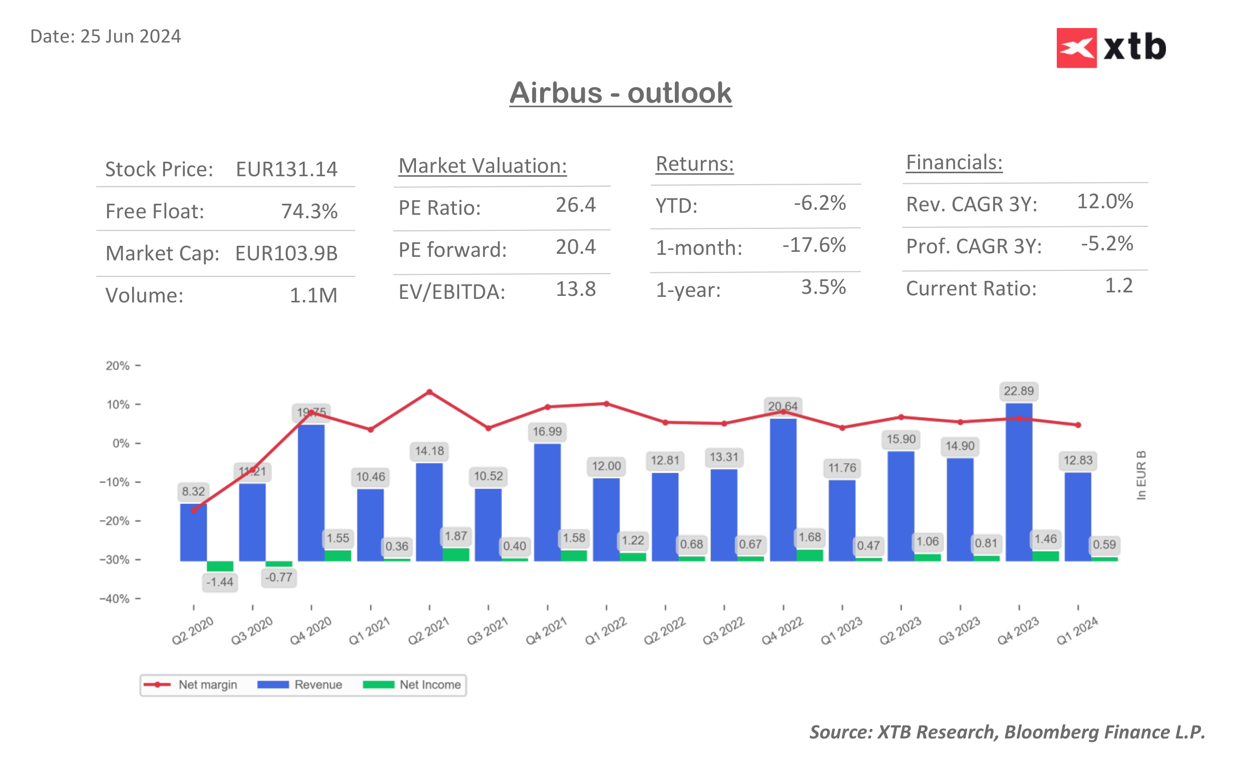 - Airbus przekazał, że koszty jednostki systemów kosmicznych wzrosły do 900 mln EUR w pierwszej połowie roku, w wyniku wyższych kosztów serwisu i pracy. W tym roku już raz Airbus zdziwił rynek słabszym, od prognoz raportem i inwestorzy spodziewają się, że problemy z zadowalającą rentownością utrzymają się. Półroczne wyniki zostaną opublikowane 30 lipca 2024 roku.