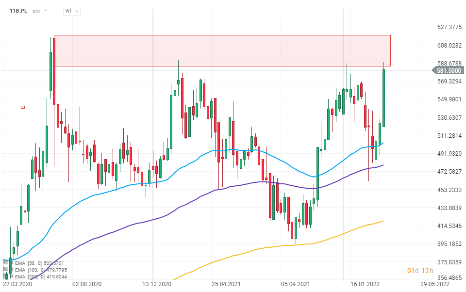 Wykres cen walorów spółki 11 bit studios (11B.PL), interwał W1. Akcje polskiej spółki z branży gier zbliżają się do stref lokalnych maksimów z lat 2020-2022. Źródło: xStation 5