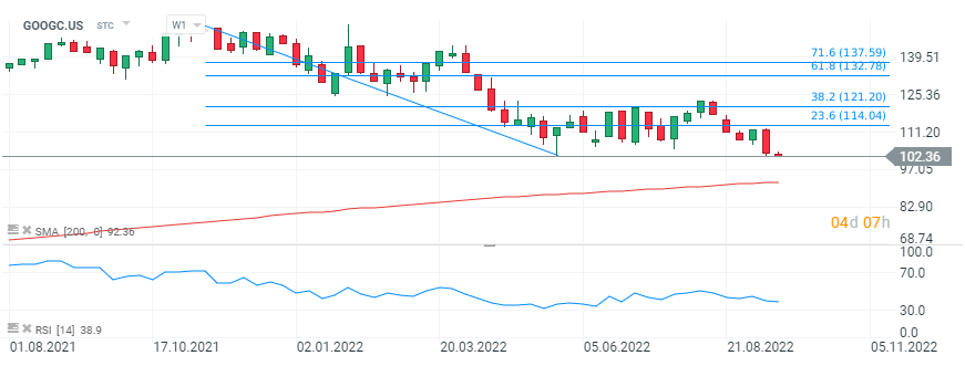 Akcje Alphabet (GOOGC.US) dotarły dziś do poziomów w okolicach 100 USD. Cena akcji jest najniższa od lutego 2021, akcje przebiły minima z czerwca bieżącego roku: