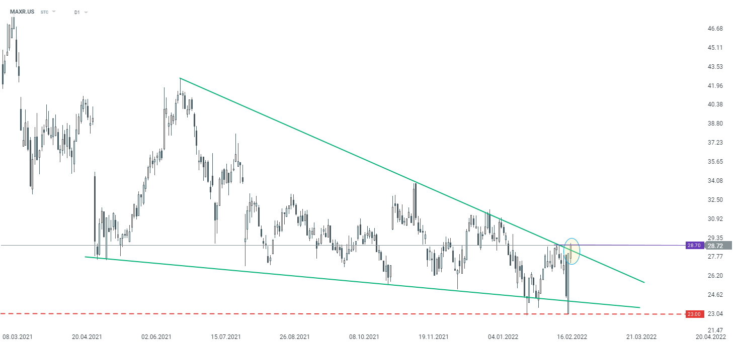 Notowania Maxar Technologies (MAXR.US) poruszały się w ostatnim czasie w klinie spadkowym. Patrząc na wykres D1, notowania nie zdołały wybić się dołem ze wspomnianej formacji. Przecena zatrzymała się na poziomie 23,00, przez co dodatkowo możemy mieć do czynienia z podwójnym dnem. Trwałe wybicie się powyżej poziomu 28,70 może przyczynić się do przyspieszenia ruchu wzrostowego. Źródło: xStation 5