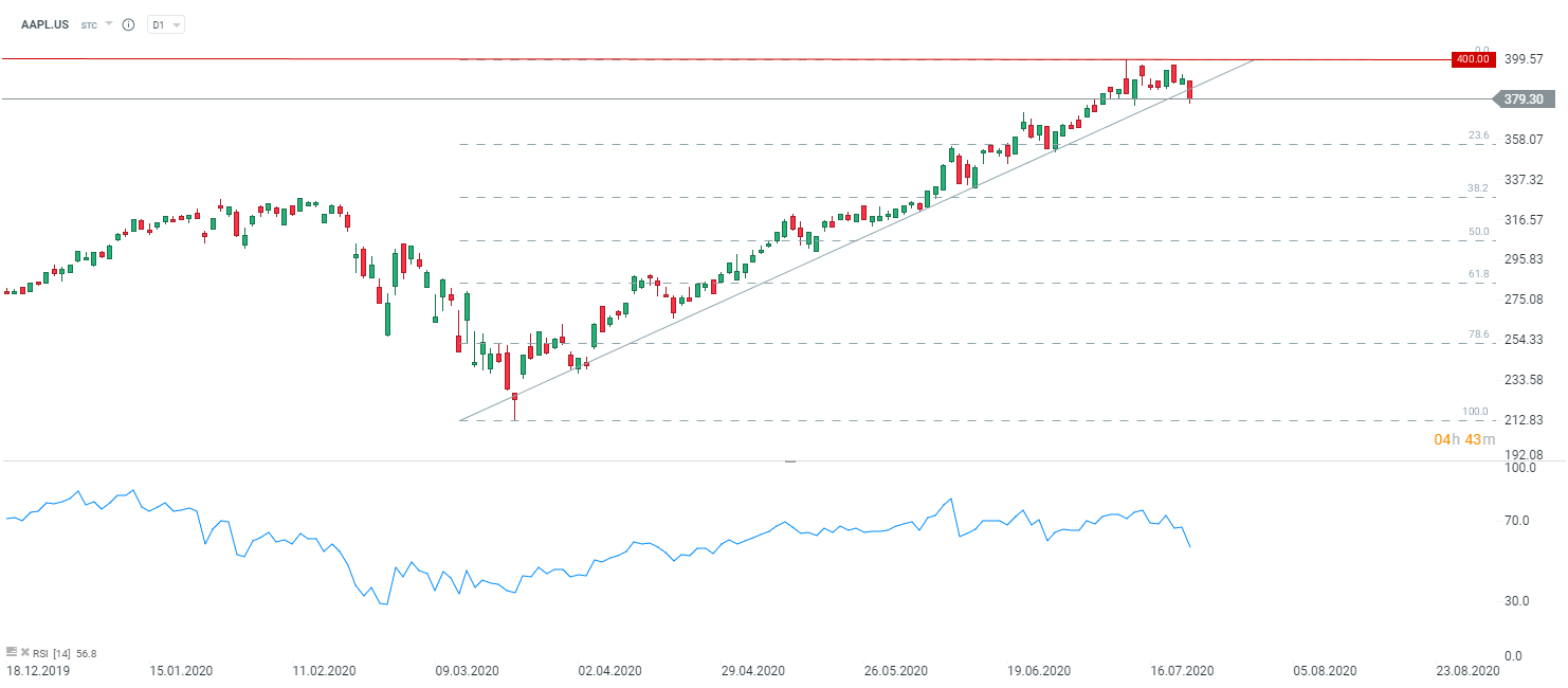Akcje Apple tracą dzisiaj niemal 3%. Jeszcze niedawno akcje Apple'a zbliżyły się do okolic 400 USD. Źródło: xStation5