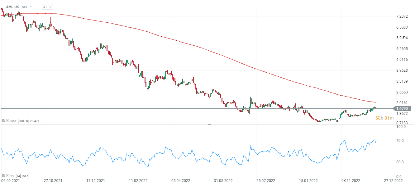 Akcje Aston Martin, interwał D1. Patrząc na notowania z szerszej perspektywy możemy dostrzec rysującą się formację spodka oraz coraz wyższych dołków, co może zwiastować próbę odwrócenia spadkowego trendu i wejścia powyżej 200 sesyjnej średniej, która przebiega przy poziomach w okolicach psychologicznego oporu tj. 2,00 GBP za walor. Źródło: xStation5