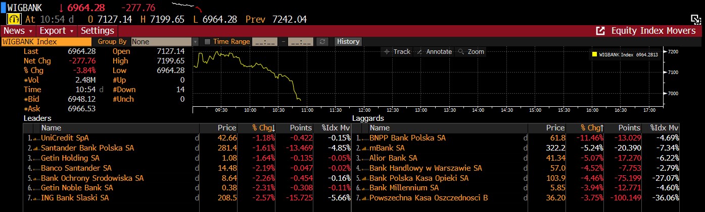 Notowania subindeksu Wig-Banki spadł na początku dzisiejszej sesji o ponad 3,5%. Źródło: Bloomberg