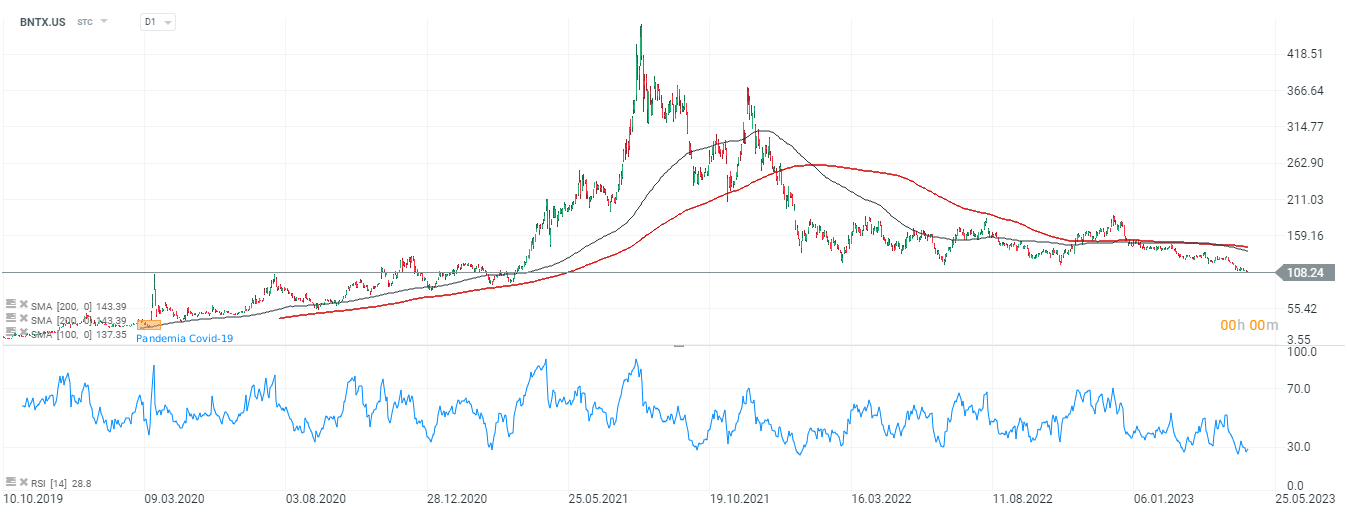 Akcje Biontechu (BNTX.US), interwał D1. Akcje spadły o blisko 80% od szczytowych wycen w okolicach 500 USD, w 2021 roku. Obecnie firma notowana jest mniej więcej 200% powyżej ceny z marca 2020 roku. Źródło: xStation5
