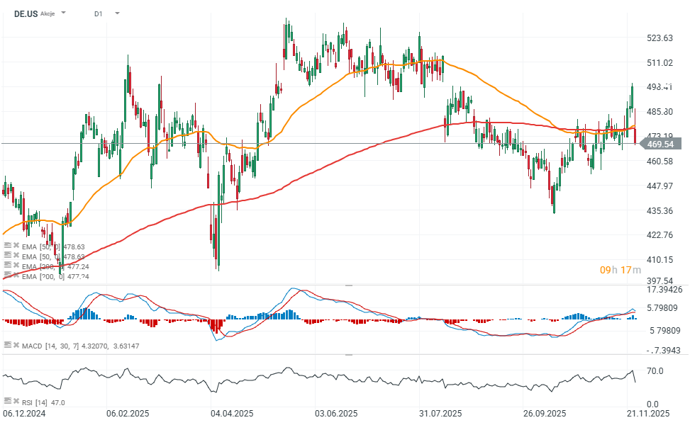 Akcje Deere spadły poniżej kluczowej średniej kroczącej EMA200 (czerwona linia), sygnalizując powrót do średnioterminowego trendu spadkowego. Na wykresie zarysowała się potencjalnie niedźwiedzia formacja głowy z ramionami, gdzie linia szyi przebiega w okolicach 430 USD za walor. Powrót do 480 USD mógłby zanegować formację i stworzyć miejsce do odreagowania.
