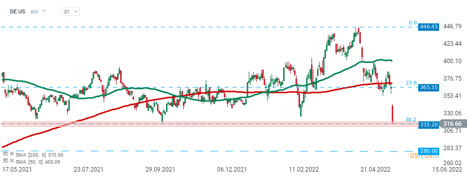 Akcje Deere & Company (DE.US) spadły o prawie 30,0% z rekordowo wysokiego poziomu 446,45 i obecnie testują ważne wsparcie na poziomie 315,20 USD, które zbiega się z 38,25 zniesieniem Fibonacciego fali wzrostowej rozpoczętej w marcu 2020 roku. Jeśli dojdzie do przełamania niższego poziomu, następny cel dla sprzedających znajduje się w okolicach poziomu 280 USD, który jest zaznaczony poprzednimi reakcjami cenowymi. Źródło: xStation5