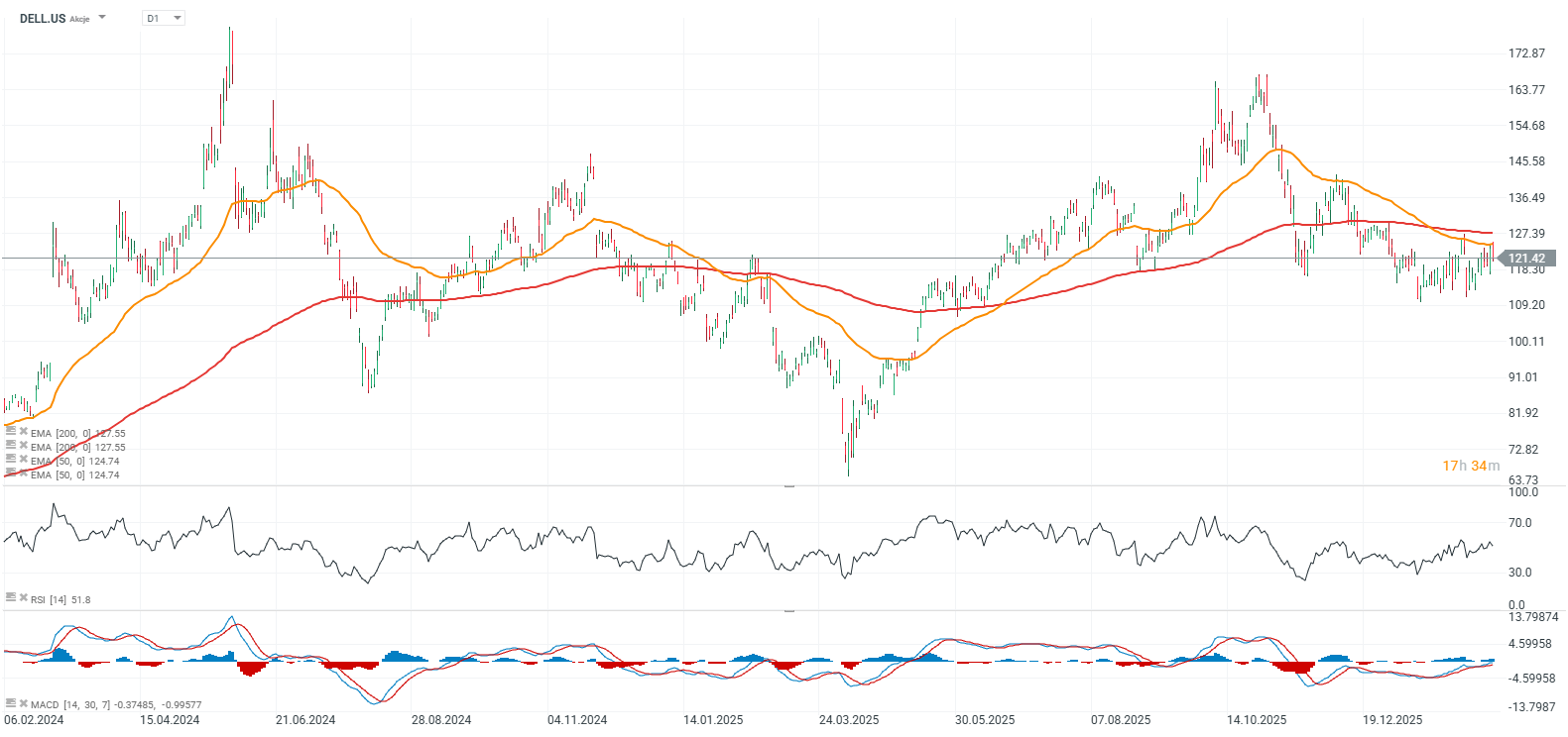 Inwestorom spodobały się przede wszystkim ambitne, ale jednocześnie wiarygodne prognozy na ten rok, wyraźnie przekraczające konsensus rynkowy. Szczególnie istotna jest zapowiedź podwojenia przychodów z serwerów AI do około 50 mld USD. Dodatkowym wsparciem dla wyceny pozostaje silny cash flow, podwyżka dywidendy oraz rozszerzenie programu skupu akcji. W efekcie Dell jest postrzegany jako jeden z głównych beneficjentów globalnego boomu inwestycyjnego w infrastrukturę sztucznej inteligencji.
