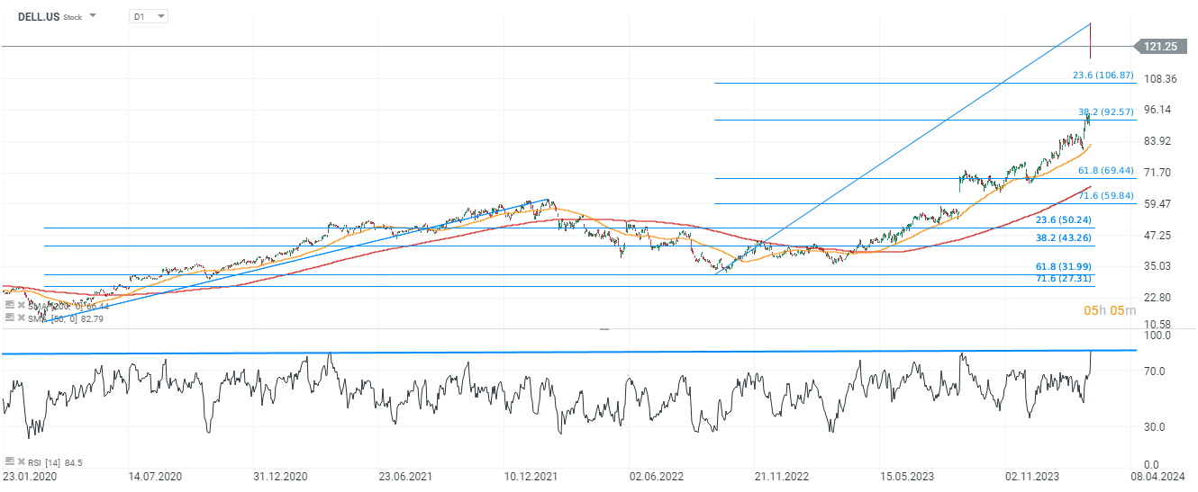 Po lepszym niż oczekiwano raporcie za IV kwartał, akcje Dell Technologies (DELL.US) wzrosły dziś ponad 28%, ponownie rozpędzając sentymenty inwestorów wokół sztucznej inteligencji. Firma przekazała, że wyniki pomógł osiągnąć silny popyt na serwery AI, Co wiecej, Dell oczekuje stopniowej poprawy wydajności biznesu w segmencie pamięci maswoej i komputerów PC. Firma spodziewa się szeregu prowzrostowych, cyklicznych czynników w bieżącym roku.