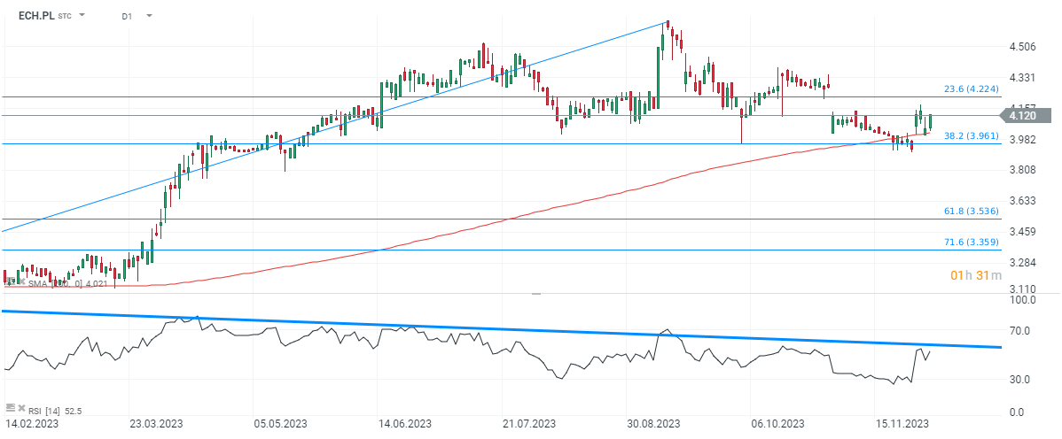 Zwyżkujące akcje Echo Investments na interwale dziennym wykazują niedźwiedzią dywergencję ze wskaźnikiem siły względnej (RSI), który notorycznie spada.