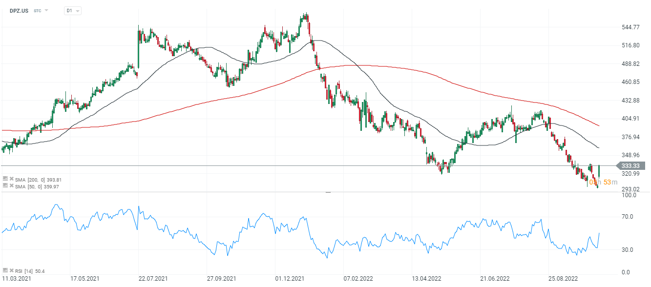 Akcje Domino's Pizza (DPZ.US), interwał D1. Akcje spółki znajdują się w silnym trendzie spadkowym od początku roku. Wskaźnik RSI wzrósł do poziomu powyżej 50 punktów jednak wciąż nie wskazuje na poziomy wykupienia. Główny opór w krótkim terminie mogą stanowić poziomy przy 360 USD, gdzie przebiega SMA50. Spadek nastrojów na indeksach może jednak spowodować cofnięcie w kierunku lokalnych minimów przy 300 USD. Źródło: xStation5