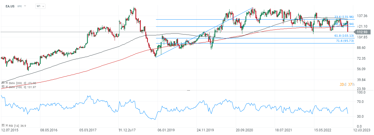 Akcje EA Sports (EA.US), interwał D1. Cena spadła poniżej SMA200 (czerwona linia) wskazujac na możliwe osłabienie i retest 61,8 zniesienia Fibonacciego fali zrostowej rozpoczętej w 2018 roku. Źródło: xStation5