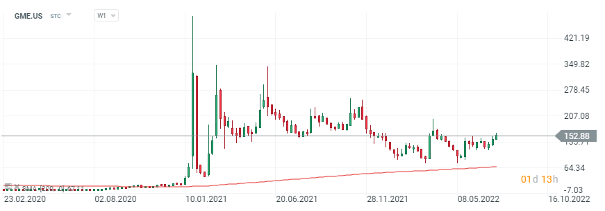Akcje spółki zyskały dużą popularność w 2021 roku, dzięki akcji ‘short squeez’ która doprowadziła do zamknięcia części krótkich pozycji inwestorów instytucjonalnych i zakończyła się potężną zwyżką ceny walorów Gamestop;
