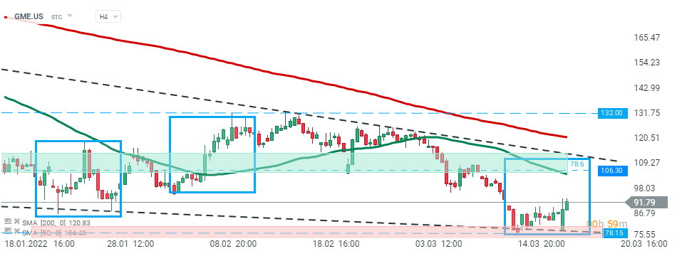 Akcje GameStop (GME.US) w ostatnich miesiącach poruszały się w trendzie spadkowym, jednak wydaje się, że kupującym udało się zatrzymać spadki w okolicach 78,15 USD, gdzie przebiega dolne ograniczenie formacji klina. Dziś akcje odrobiły przedrynkowe straty i jeśli obecny sentyment się utrzyma, ruch w górę może przyspieszyć w kierunku głównej strefy oporu w okolicach 106,30 USD, która jest wyznaczona przez górne ograniczenie struktury 1:1, 78,6% zniesienia Fibonacciego ostatniej fali spadkowej i górne ograniczenie formacji klina. Źródło: xStation5