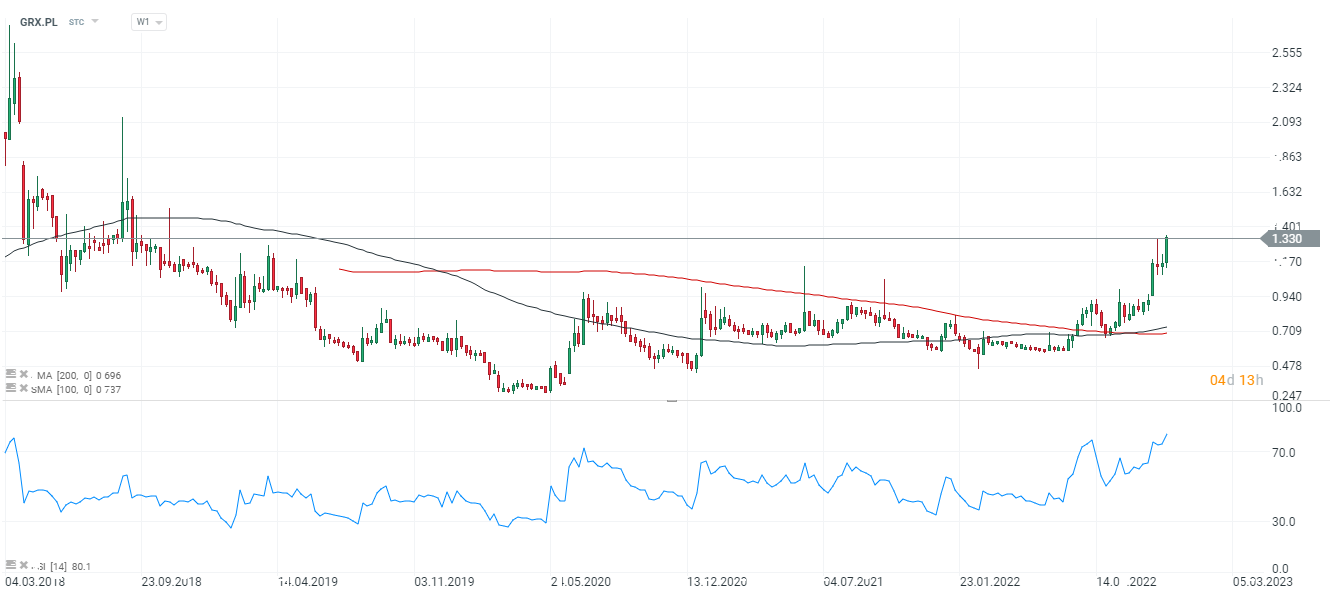 Wykres GreenX Metals Limited(GRX.PL), interwał W1. Wykres na szerokim interwale przypomina byczą formację spodka, jesienią możemy zaobserwować również tzw. 'złoty krzyż', gdy średnia 100 okresowa (czarny) przecięła od dołu 200 sesyjną (czerwony) sygnalizując zmiane trendu. RSI przy 80 punktach zbliża się do ekstremalnych poziomów wykupienia i może zwiastować korektę w kierunku 1,20 PLN. Źródło: xStation5