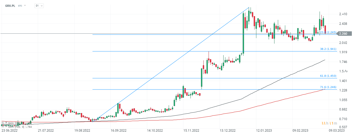 Akcje GreenX (GRX.PL), interwał D1. Spadek cen akcji zatrzymał się na poziomie 23,6 zniesieniu Fionacciego fali wzrostowej rozpoczętej jesienią 2022 roku. Jeśli wsparcie to pozostanie utrzymane, możliwy jest ruch w górę - jeśli podaż zdominuje notowania kolejnym wartym uwagi poziomem jest 38,2 w okolicach 2 PLN, które wyznaczają również poprzednie reakcje cenowe. Źródło: xStation5