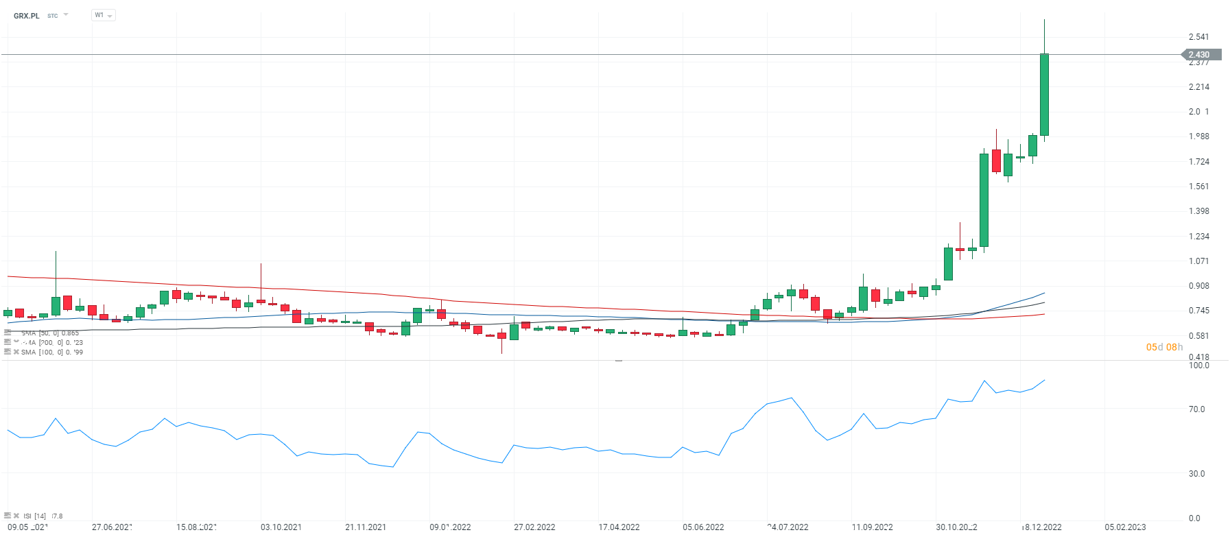 Akcje GreenX Metals (GRX.PL), interwał W1. Euforia na akcjach wskazuje na poziom wskaźnika siły względnej (RSI) bliski 88 pkt., sygnalizujący poziom wykupienia. Źródło: xStation5