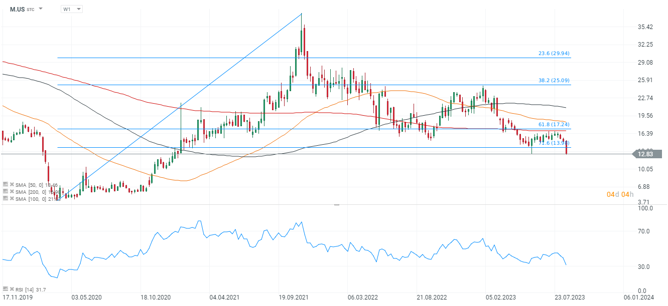 - Macy's podtrzymało prognozy na fiskalny 2023 rok. Oczekuje się, że sprzedaż netto wyniesie od 22,8 mld USD do 23,2 mld USD (spadek o 6% do 7,5% r/r)