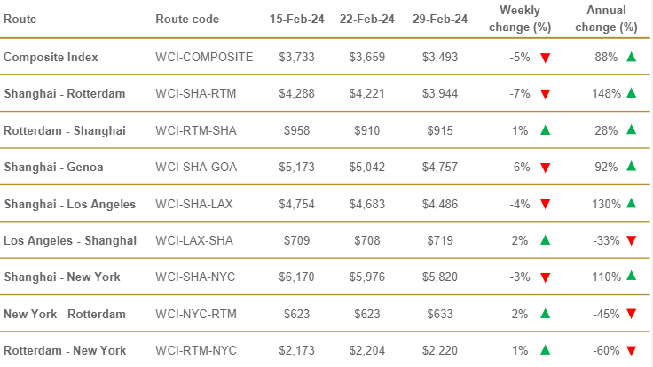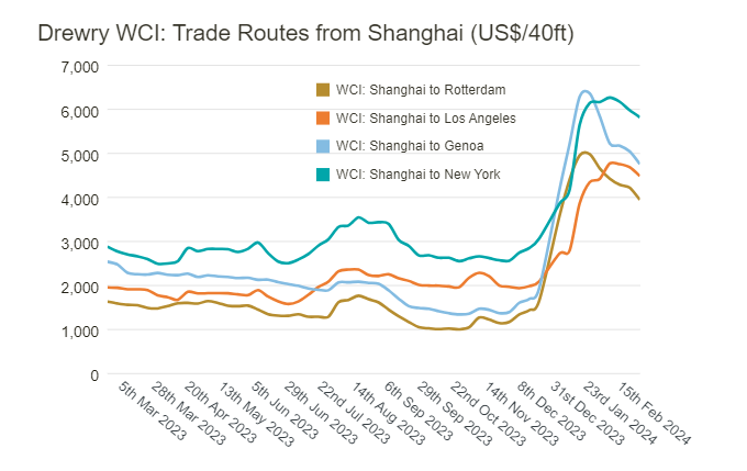Koszty frachtu standardowego kontenera 40 stopowego w ostatnim czasie spadły, po potężnym rajdzie, napędzanym przez obawy wokół Morza Czerwonego. Źródło: Drewry Shipping