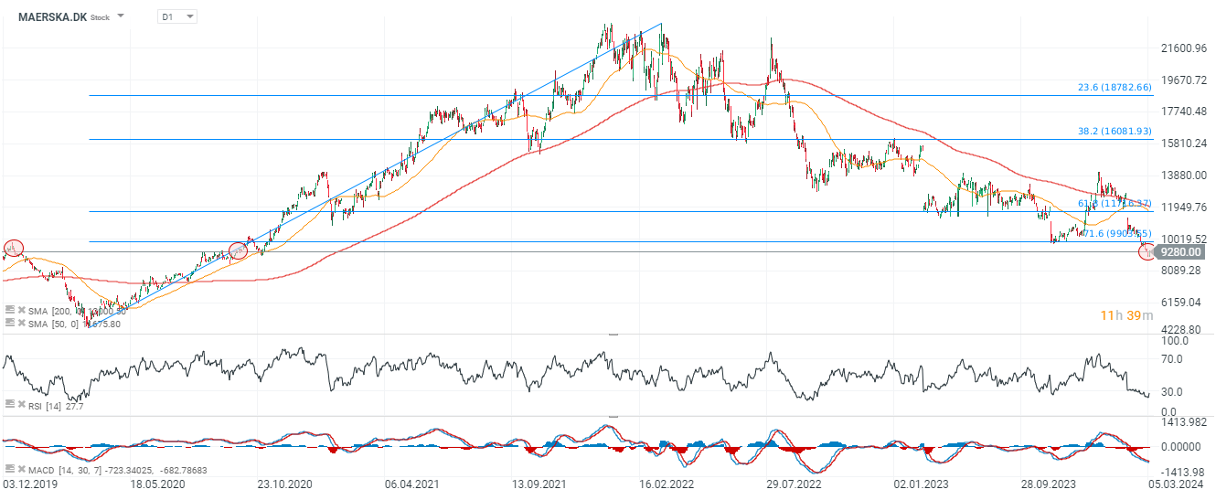 Największym zagrożeniem dla spółki wydaje się perspektywa ograniczonego popytu konsumenckiego, co może postawić ją w trudnej sytuacji finansowej, biorąc pod uwagę koszty logistyczne i problemy w terminowości oraz płynności dostaw. Co ciekawe, pomimo wciąż niepewnej sytuacji we frachcie towarowym (gdzie sam wzrost stawek nie równoważy firmom wszystkich kosztów i nie gwarantuje poprawy zysków) akcje konkurencyjnego Hapag Lloyd (HLAG.DE) nie odnotowały spadku porównywalnego z Maersk, obrazując, że część problemów może związana być z wyzwaniami logistycznymi Maersk. W IV kw. firma zaprezentowała stratę netto 410 mln EUR, na tle której nawet I kw. 2020 roku (covid) wygląda dobrze, notowała wtedy 180 mln EUR zysku.