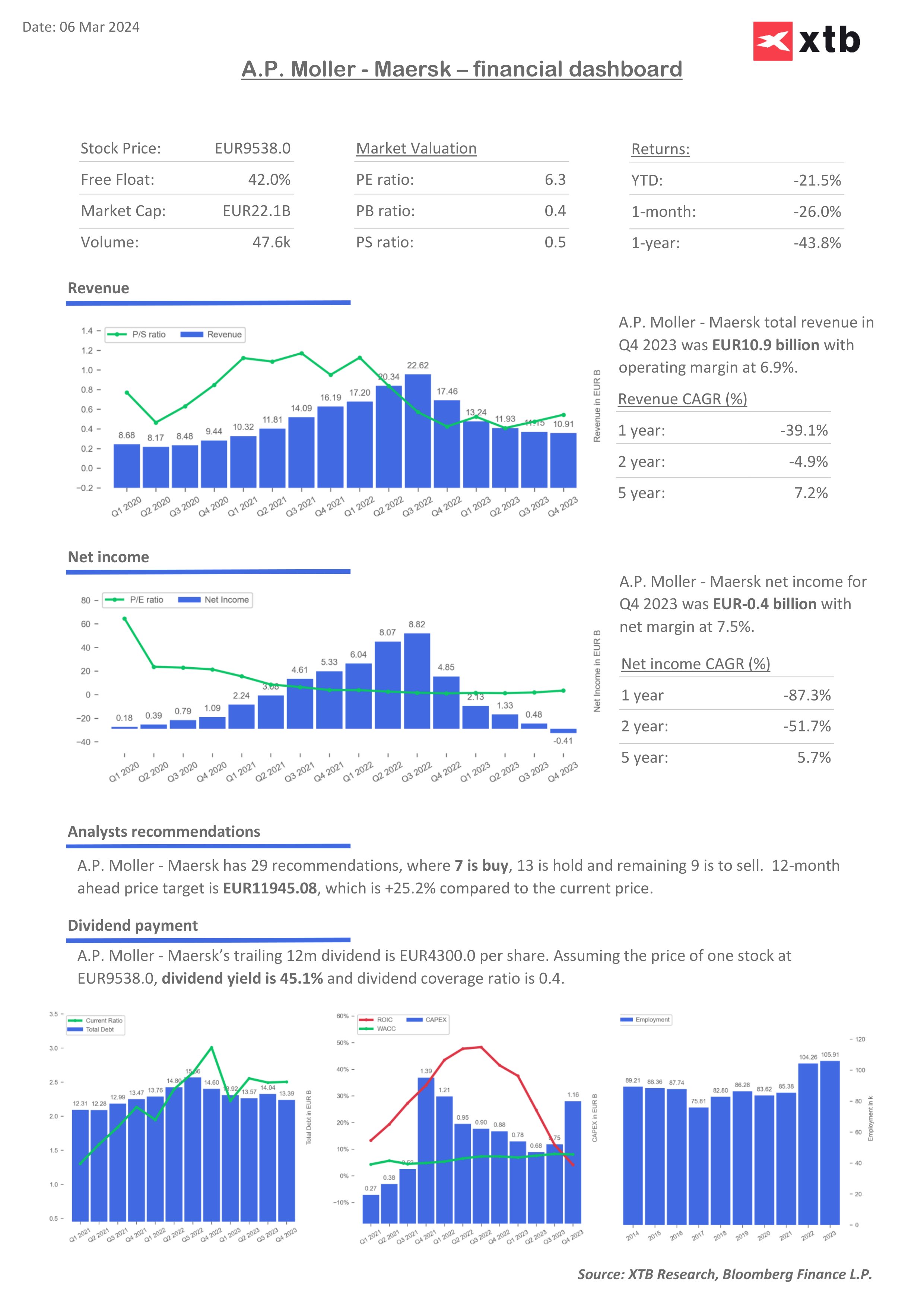 Zwrot z inwestowanego kapitału (ROIC) potężnie tąpnął z bardzo wysokich, blisko 50% poziomów osiąganych w 2022 roku, do niespełna 10% obecnie, osuwając się poniżej średniego ważonego kosztu kapitału (WACC). Taka sytuacja w pełni usprawiedliwia spadającą wycenę. Wskaźnik ceny do sprzedaży na poziomie 0,5, podobnie jak c/wk z blisko 60% dyskontem od wartości księgowej (co ciekawe, bez znaczącego długu, który w relacji do 'equity' Maersk stanowi ok. 8%) mogą wydawać się atrakcyjne, odzwierciedlają jednak wysoką cykliczność branży.
