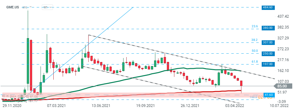 Akcje GameStop (GME.US) spadły o prawie 50% od ostatniego maksimum z końca marca 2022 roku. Niemniej jednak akcje odbiły się od ważnego wsparcia na poziomie 41,60 USD, które jest zaznaczone poprzednimi reakcjami cenowymi. Dopóki cena utrzymuje się powyżej tego wsparcia, nie można wykluczyć wznowienia ruchu wzrostowego. Źródło: xStation5