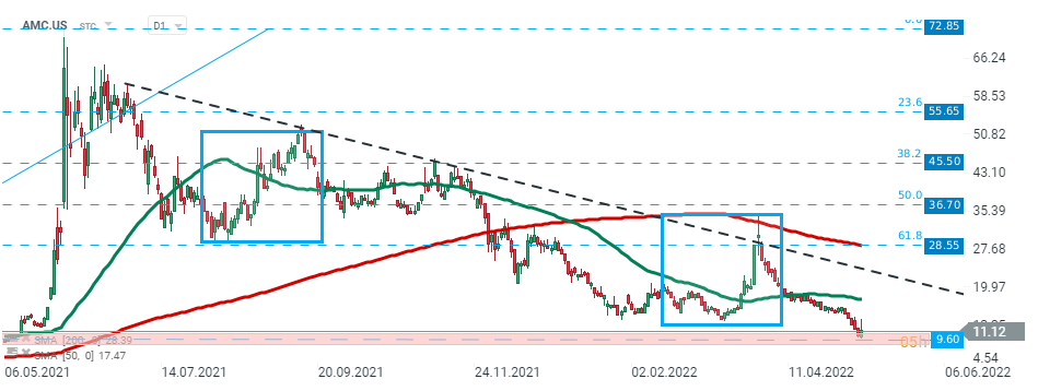 Akcje AMC (AMC.US) gwałtownie spadły z ostatniego maksimum na poziomie 35,00 USD, które wyznacza górne ograniczenie struktury 1:1 i obecnie testują wsparcie na poziomie 9,60 USD. Źródło: xStation5