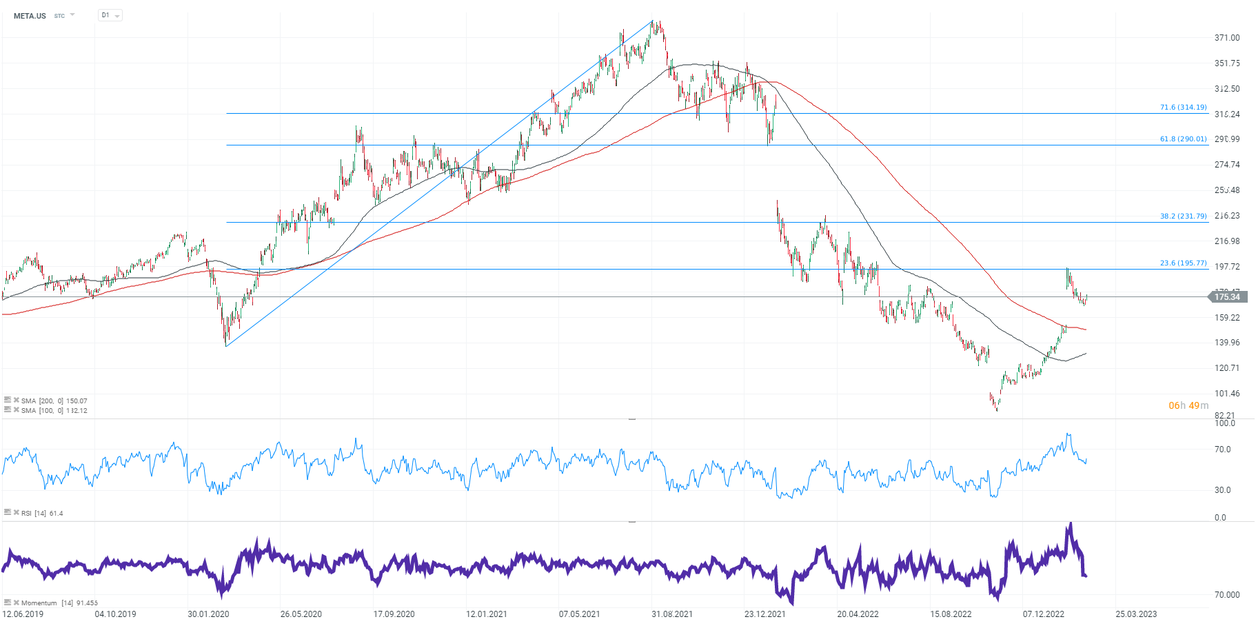 Akcje Meta Platforms (META.US), interwał D1. Wskaźnik RSI wciąż jest nautralny, a wskaźnik Momentum uległ zdecydowanemu ochłodzeniu po wybiciu szczytów w styczniu. Cena odbiła się od 71,6 zniesienia Fibonacciego fali wzrostowej zapczątkowanej w marcu 2020 roku, poziom 190 USD wydaje się głównym krótkoterminowym oporem dla byków. Źródło: xStation5