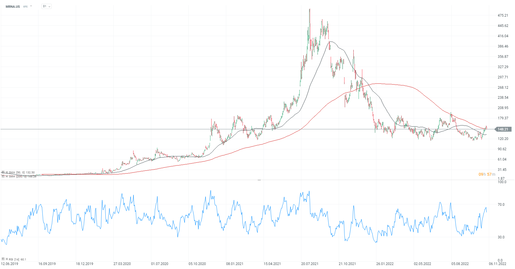 Akcje producenta szczepionek Moderna (MRNA.US) tracą dziś blisko 10% po otwarciu Wall Street w obliczu słabszych wyników za III kwartał i obniżonych prognoz spółki. Dodatkowo rynek akcji obciążyła wczorajsza, jastrzębia konferencja szefa Fed, Powella oraz determinacja Rezerwy Federalnej w doprowadzeniu inflacji do celu 2%: