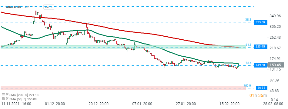 Akcje spółki Moderna (MRNA.US) w ostatnich miesiącach mocno spadały, jednak wydaje się, że kupującym udało się wyhamować spadki w okolicach poziomu 149,60 USD, który pokrywa się z poziomem 78,6% zniesienia Fibonacciego fali wzrostowej zapoczątkowanej na początku 2020 roku oraz SMA 50 (zielona linia). Dopóki cena znajduje się w pobliżu tego poziomu, ruch wzrostowy może zostać wznowiony. Jeśli jednak selekcjonerzy będą starali się odzyskać kontrolę, wówczas może pojawić się kolejny impuls spadkowy w kierunku wsparcia na poziomie 56,55 USD. Źródło: xStation5