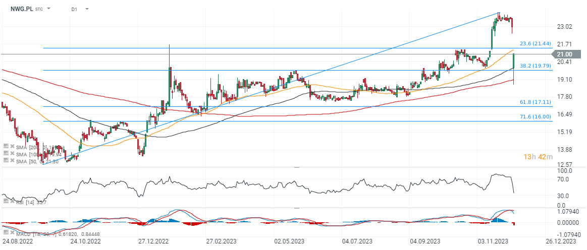 Akcje spółki bardzo szybko pozbierały się po panicznych spadkach na otwarciu, gdy walory traciły przeszło 15%. Obecnie spadki sięgają 9%, a celem dla byków pozostaje SMA50 (pomarańczowa linia) i 23,6 zniesienie Fibonacciego fali wzrostowej z jesieni 2022 roku. Co istotne, spadki zostały zatrzymane na poziomie 200-dniowej średniej kroczącej (SMA200).