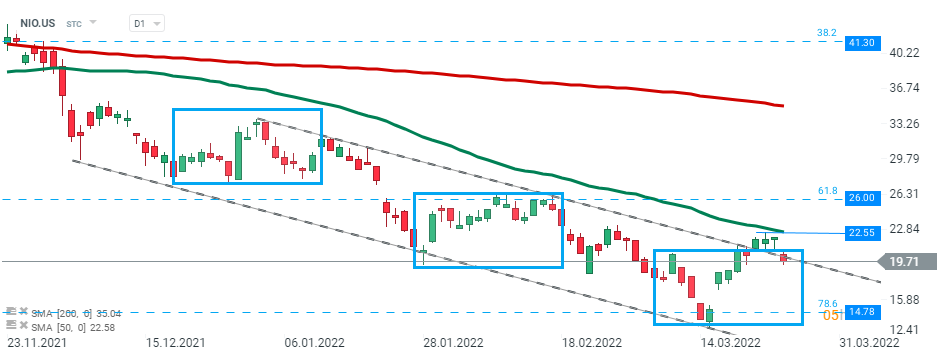 Cena akcji NIO (NIO.US) gwałtownie spadła w ostatnich miesiącach, jednak w tym tygodniu kupującym udało się przebić powyżej górnej granicy kanału spadkowego, która pokrywa się z górnym limitem struktury 1:1. Mimo to ruch w górę okazał się krótkotrwały i cena cofnęła się po tym, jak byki nie zdołały przebić się powyżej 50 SMA (zielona linia). W trakcie dzisiejszej sesji cena powróciła poniżej górnej granicy kanału. Jeśli obecne nastroje się utrzymają, ruch spadkowy może przyspieszyć w kierunku wsparcia na poziomie 14,78 USD. Źródło: xStation5