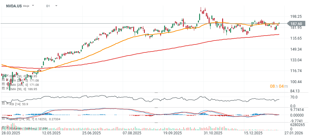 Akcje Nvidia rosną dziś ponad 1% po tym jak Bloomberg poinformował, że państwowy regulator w Chinach wstępnie pozwolił na rozpczęcie przez trzy największe chińskie firmy technologiczne: Alibabę, Tencent i ByteDance rozmów na temat importu chipów AI H200. Po doniesieniach akcje spółki zdołały wrócić powyżęj średniej EMA50 (pomarańczowa linia), która przebiega w okolicach 187 USD za akcję.