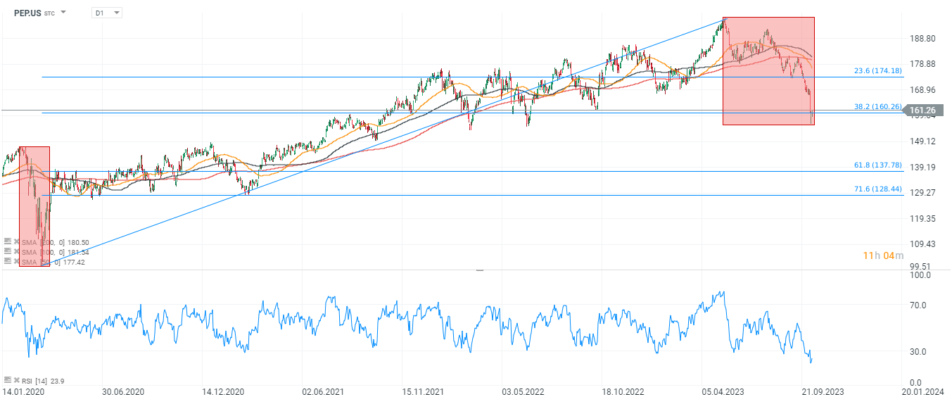 W ostatnim czasie poziom wyprzedania okazał się już ekstremalny z RSI na interwale D1 na poziomie 22 pkt - poniżej poziomów z pandemicznego dołka 2020 roku. Obecnie akcje notowane są w okolicach 164 USD przed otwarciem rynku, a wyprzedaż została powstrzymana na poziomie 38,2 zniesienia Fibonacciego fali wzrostowej z marca 2020 roku. Kluczowy opór (SMA200, czerwonia linia) przebiega jednak znacznie wyżej - w okolicach 180 USD za walor. Akcje spółki od szczytów w okolicach 200 USD odnotowały blisko 20% korektę, co w przypadku Pepsico nie zdarza się często.