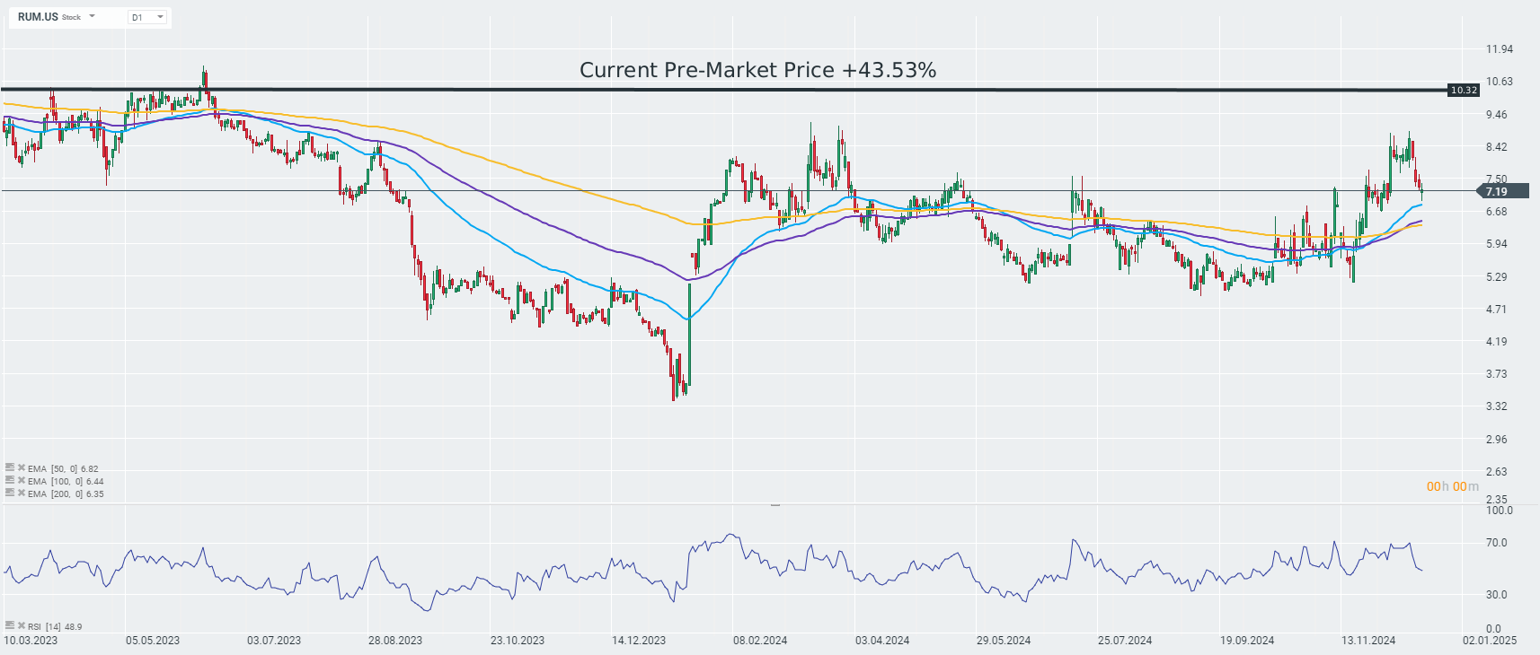 Akcje spółki Rumble (RUM.US), bezpośredniego konkurenta YouTube zyskują przed rozpoczęciem dzisiejszej sesji blisko 44% po tym jak Tether, emitent największego na świecie stablecoina USDT podjął decyzję o zakupie wartych 775 mln USD akcji spółki. Średnia cena nabycia to 7,5 USD za walor.