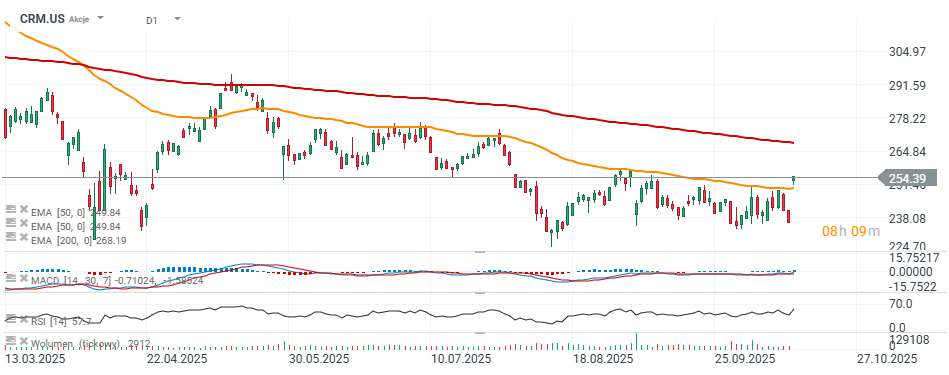 Podczas konferencji Dreamforce Investor Event Salesforce przedstawił odważną prognozę — przychody przekroczą 60 miliardów dolarów do roku fiskalnego 2030. Cel ten przewyższa konsensus Wall Street (58,37 mld USD) i nie obejmuje jeszcze spodziewanych zysków z przejęcia Informatica za 8 mld USD, które ma zostać sfinalizowane w najbliższym czasie. Akcje spółki rosną dziś o prawie 8%. Spółka oczekuje organicznego wzrostu CAGR przekraczającego 10% w latach 2026–2030, co podkreśla jej stabilny potencjał ekspansji w segmencie chmurowym i AI. Nowa strategia Salesforce zakłada osiągnięcie tzw. „50 by FY30”, czyli kombinacji 50% wzrostu subskrypcji oraz marży operacyjnej w ujęciu non-GAAP.