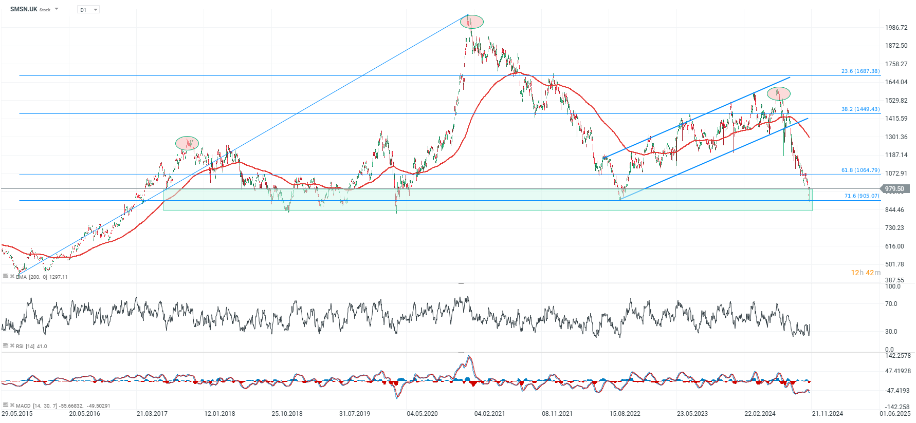 Akcje Samsunga zareagowały na poziomie kluczowego wsparcia wyznaczonego przez 71.6 zniesienie Fibo fali wzrostowej z 2016 roku, poprzednie, silne reakcje cenowe z 2020 i 2022 roku oraz potencjalną linię szyi w formacji głowy z ramionami (RGR). Spadek poniżej 900 USD mógłby otworzyć drogę do wymazania całego, 8-letniego impulsu wzrostowego i test okolic 500 USD za walor.