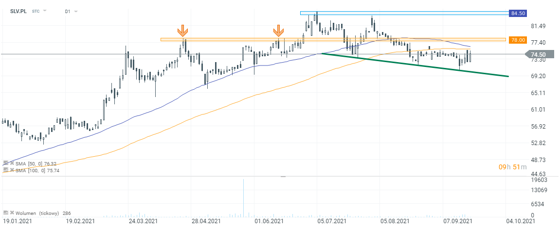 Cena akcji Selvity (SLV.PL) znajduje się od początku sierpnia w trendzie spadkowym. Ostatnio kurs próbował odbijać, jednak nie udało się dokonać wybicia dwóch średnich kroczących: 50- oraz 100-sesyjnej. Linia poprowadzona po niedawnych dołkach jest już namalowana w oparciu o 3 lokalne minima, w przyszłości będzie można ją uznać za potencjalne wsparcie (gdyby scenariusz spadkowy był kontynuowany). Jednym z oporów mógłby z kolei być poziom 78 PLN (dwa lokalne maksima). Dotarcie w te rejony wymagałoby jednak przebicia wspomnianych średnich kroczących. Źródło: xStation5