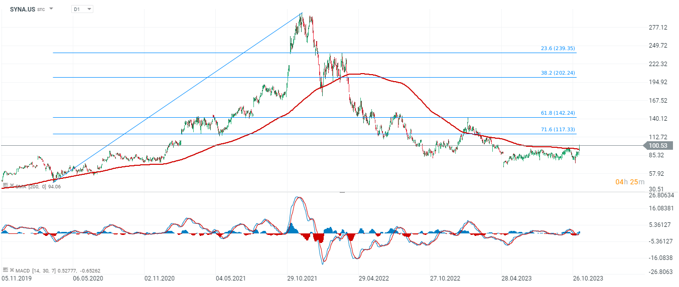 Akcje Synaptics (SYNA.US) wybijają się dziś ponad średnią SMA200 (czerwona linia). Źródło: xStation5