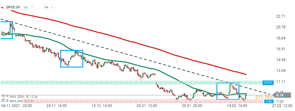 Akcje spółki Virgin Galactic (SPCE.US) straciły ponad 80% w ciągu ostatniego roku, jednak ruch spadkowy zatrzymał się w okolicach wsparcia na poziomie 7,60 USD. Niemniej jednak dopiero zdecydowane wybicie powyżej oporu na poziomie 10,95 USD oznaczałoby zmianę sentymentu na byczy. Do tego czasu scenariuszem bazowym wydaje się być kontynuacja handlu w szerokim zakresie. Źródło: xStation 5