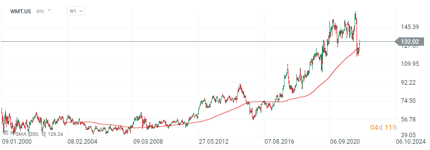 Wykres akcji WalMart (WMT.US), interwał W1. Cena akcji giganta sprzedażowego szybko wróciła powyżej 200 sesyjnej średniej kroczącej, która stanowiła dla ceny wieloletnie wsparcie i wyznaczała wzrostowy trend. Dzisiejsza cena w handlu przed otwarciem sugeruje spadek poniżej 120 USD co znaczy, że niedźwiedzie ponownie przetestują 200 SMA. Spółka notowana jest z wciąż wysoką premią, wskaźnik P/E wynosi 28, przy średniej w okolicach 20 dla S&P500 i 19 dla indeksu Dow Jones. Źródło: xStation5