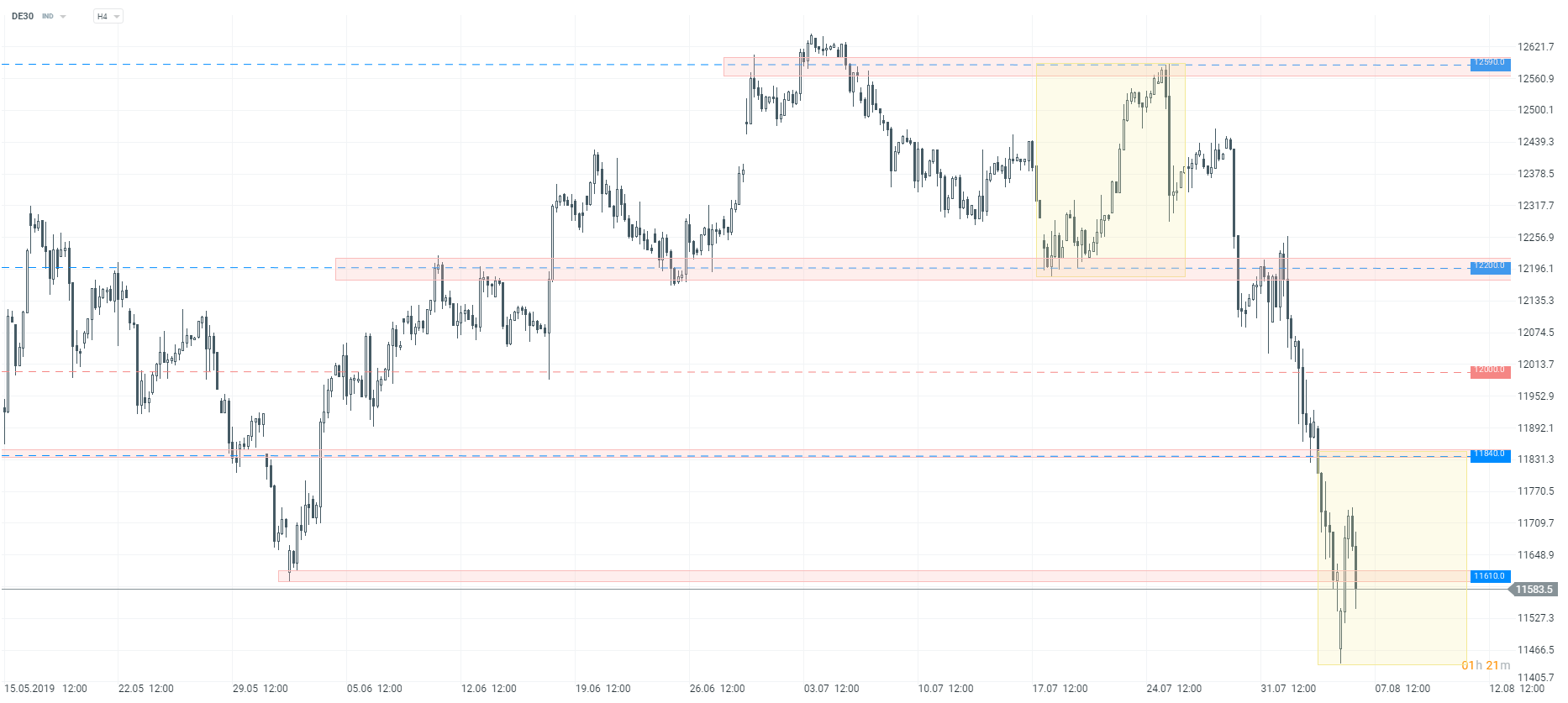 Jeśli chodzi o niższy przedział czasowy - H4, obowiązuje tendencja spadkowa. Kluczowym oporem jest strefa przy 11840 pkt, wynika ona nie tylko z wcześniejszej reakcji ceny, ale także ze spadkowego układu Overbalance (żółte prostokąty). Tak długo jak kurs znajduje się poniżej, obowiązuje tendencja spadkowa. Jeżeli podczas kolejnych sesji poziom byłby testowany, miesjce może być bronione przez sprzedających, dopeiro jego pokonanie, może zmienić tendencję na wzrostową.