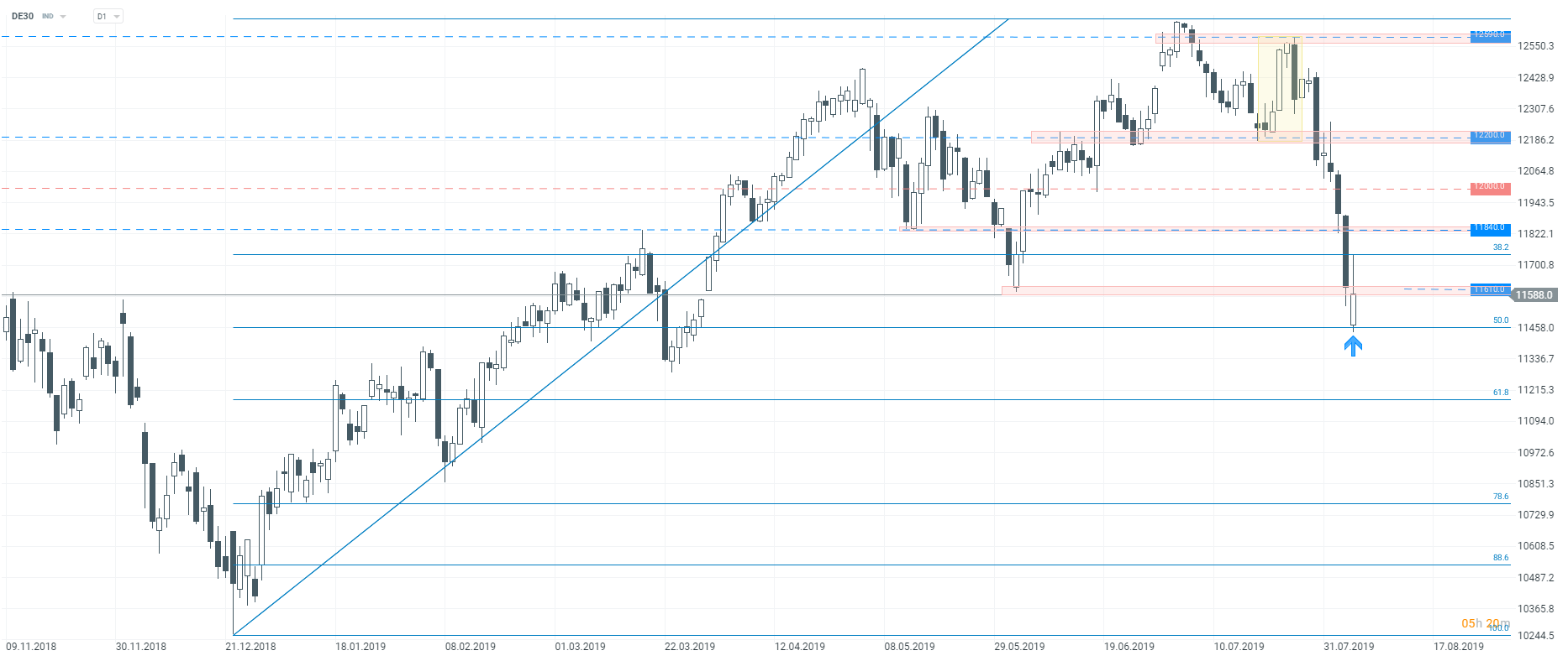 Niemiecki indeks giełdowy otworzył się we wtorek wyraźną luką spadkową, niemniej od początkowych godzin handlu było widać wyraźne ożywienie strony kupującej. Ruch w górę słabnie jednak w godzinach popołudniowych. Euforii nie widać też na rynku amerykańskim, co prawda indeksy znajdują się na plusie, niemniej na razie wygląda to jedynie na korektę ostatnich silnych spadków. Patrząc na interwał D1, kurs ponownie cofa poniżej dołków z początku czerwca, co może oznaczać, że po raz kolejny zobaczymy zejście w okolice mierzenia 50% ostatniej fali wzrostowej, gdzie dziś reagował popyt. Co ciekawe współczynnik 38,2% zadziałał jako opór, powstrzymując większe wzrosty.