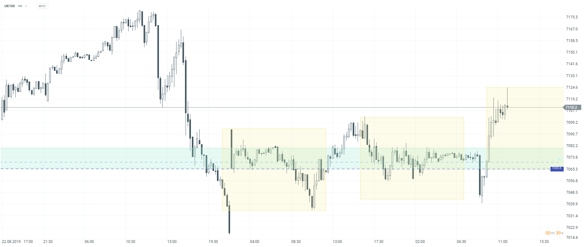 Z kolei na angielskim indeksie możemy obserwować wzrosty, a to za sprawą silnych spadków na kursie funta. Jako jedyny z trójki analizowanych instrumentów, UK100 znajduje się na plusie wynoszącym 0,4%. Niemniej w ostanich minutach można obserwować nieznaczne cofnięcie, które może doprowadzić do większej korekty dzisiejszych wzrostów. Jeśli dojdzie do spadków, to należy wziąć pod uwagę dolne ograniczenie lokalnego układu 1:1 - 7056 pkt, które powinno stanowić istotne wsparcie.