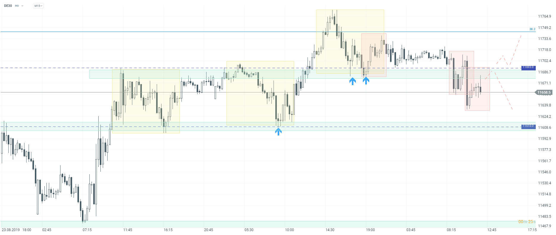 DE30 utrzymuje się poniżej krótkoterminowej strefy oporowej. Niewykluczone spadki w kierunku 11 610 pkt. Źródło: xStation