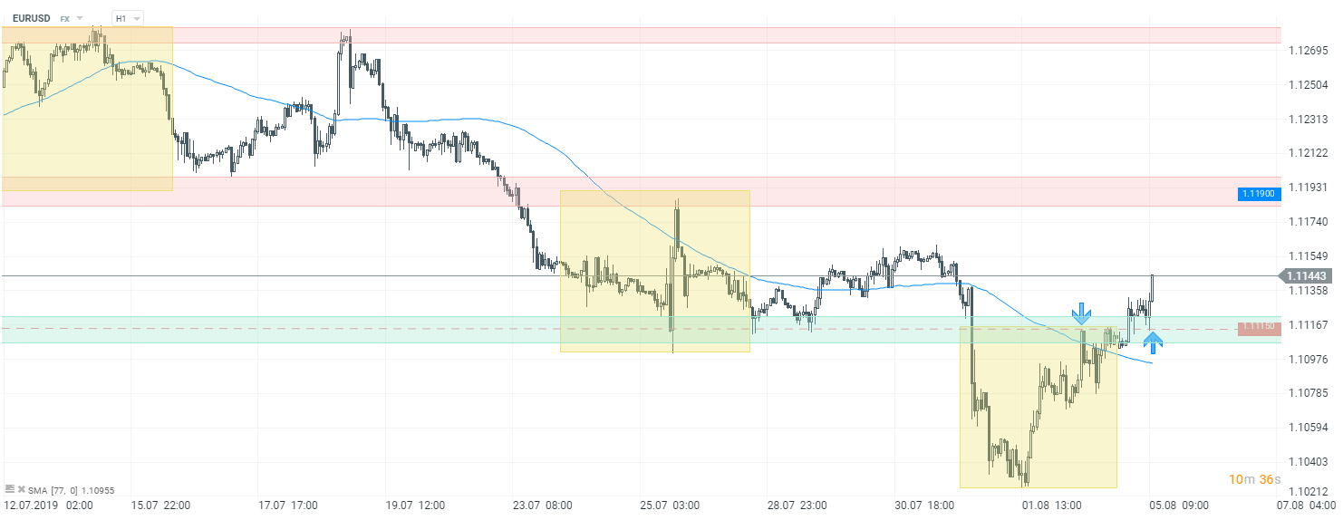 Kurs euro do dolara wyraźnie rośnie na poniedziałkowej sesji. Pod koniec ubiegłego tygodnia broniona była strefa oporowa, która wynikała między innymi z układu Overbalance, a także z ostatnio wybitych dołków. Ostatecznie opór został jednak pokonany. Tym samym zmienia się krótkoterminowa tendencja. Dziś w godzinach porannych cena przetestowała od drugiej strony wybity wcześniej poziom 1,1115, a po danych ze strefy euro, ruch w górę jest kontynuowany. Technicznie, tak długo jak cena utrzymuje się powyżej strefy zaznaczonej kolorem zielonym, obowiązuje tendencja wzrostowa z celem na 1,1190. Dopiero powróć poniżej zmieni sentyment na spadkowy.
